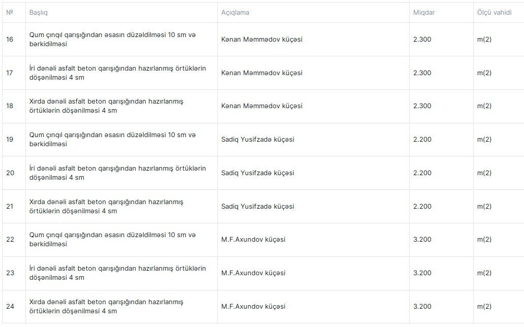 Tərəflər arasında bağlanacaq satınalma müqaviləsinin şərtlərinə görə, şirkət Ağdaş RİH üçün Fərid Məmmədzadə, Əlibəy Hüseynzadə, Karvan yolu, Ceyhun Əliyev, Kənan Məmmədov, Sadiq Yusifzadə, M.F.Axundov küçələrində, həmçinin M.İsayev küçəsi dalan 8-də, ümumi sahəsi 21174 kvadrat-metr olan ərazidə qum-çınqıl qarışığından əsasın düzəldilməsi və bərkidilməsi, eləcə də iri dənəli asfalt-beton qarışığından hazırlanmış örtüklərin döşənməsi, xırda dənəli asfalt-beton qarışığından hazırlanmış örtüklərin döşənməsi işlərini həyata keçirəcək.