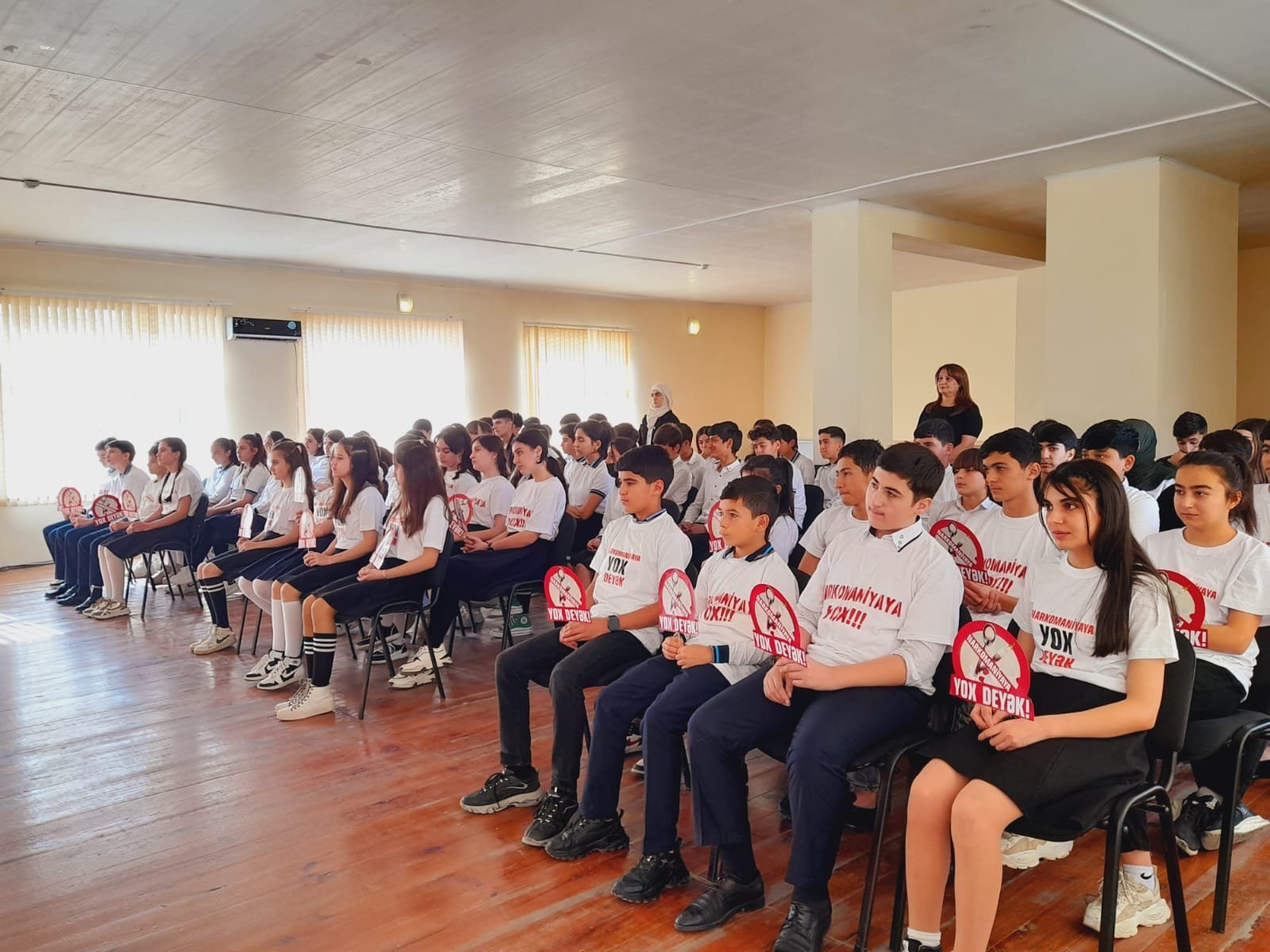 Tədbirdə çıxış edən rəis müavini polis, polkovnik-leytenantı Farid Vəliyev dövrümüzün ağır bəlası olan narkomaniyanın insanlara vurduğu mənəvi və maddi zərərlərdən danışıb. Bu bəlaya düçar olmuş şəxslərin sağlam həyata qayıtmasının çox çətin olduğunu qeyd edən rəis müavini, şagirdlərə diqqətli olmağı, narkotik aludəçisinə çevrilmiş şəxslərdən uzaq durmağı tövsiyə edib. Daha sonra çıxış edən digər iştirakçılar narkomaniyanın tək ölkəmiz üçün deyil, bütün dünya üçün təhlükə mənbəyi olduğunu xatırladaraq, narkomaniyaya qarşı aparılan mübarizə tədbirlərindən, qəbul olunan dövlət proqramlarından danışıblar. Bu istiqamətdə aparılan genişmiqyaslı maarifləndirici tədbirlərin əhəmiyyətindən bəhs edən məruzəçilər, çıxışlarının sonunda məktəblilərə təhsillərində uğurlar arzulayıblar.
