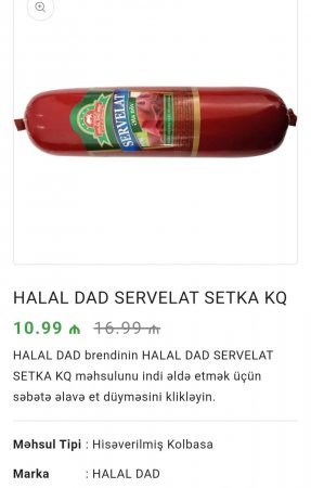 Mağaza və marketlərdə müxtəlif adla satışa çıxarılan əksər növ kolbasaların tərkibində zərərli qida əlavələri var. Belə tərkibdə kolbasa istehsalı ilə məşğul olan şirkətlərdən biri də “Halal Dad” MMC-dir.Bu müəssisənin “Servelat” bişirilmiş və hisə verilmiş kolbasaların hazırlanmasında insan orqanizmi üçün zərərli olan qida əlavələrindən istifadə edilib.