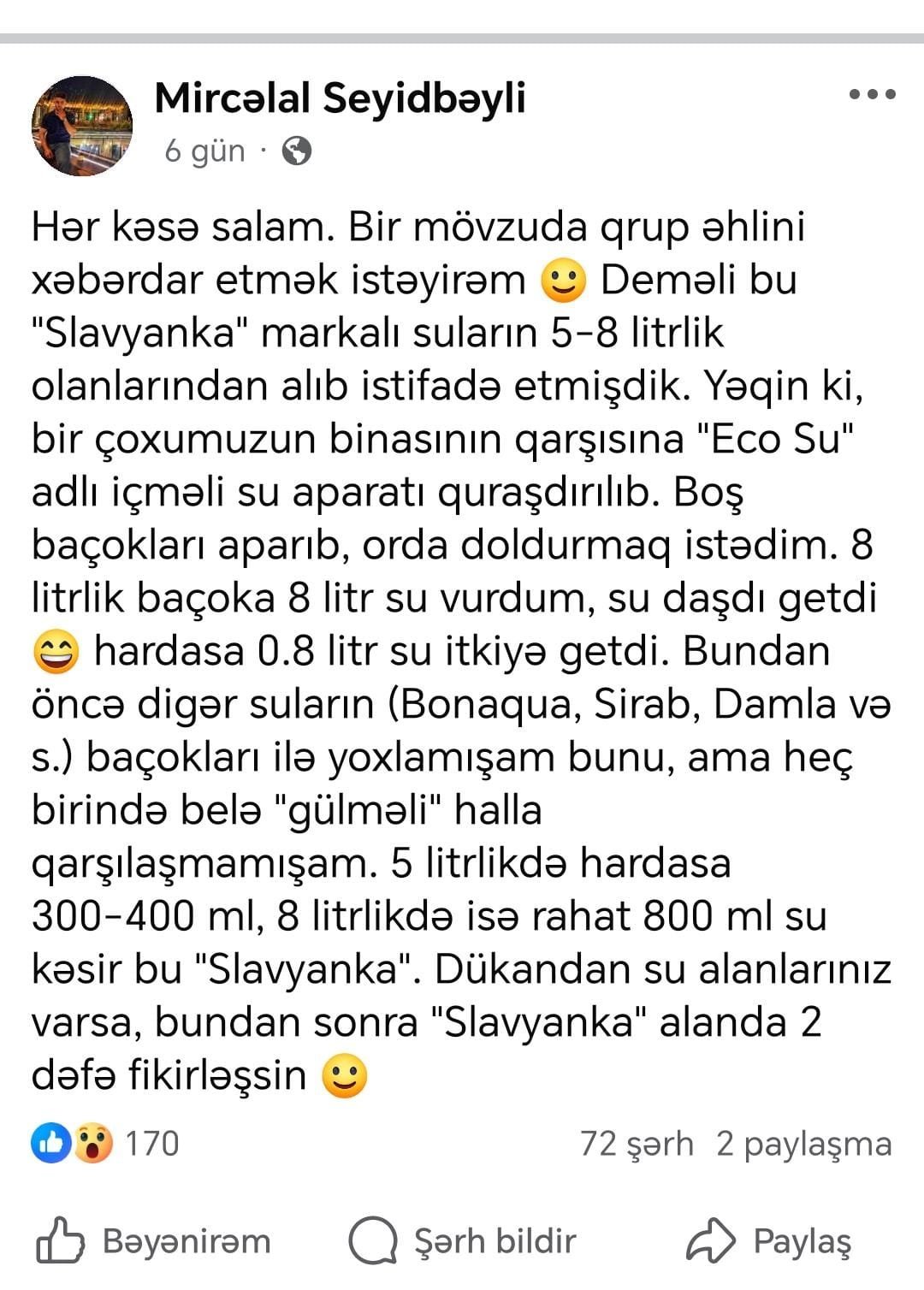 “Bu “Slavyanka” markalı suların 5-8 litrlik olanlarından alıb istifadə etmişdik. Yəqin ki, bir çoxumuzun binasının qarşısına “Eco Su” adlı içməli su aparatı quraşdırılıb. Boş olan 8 litr tutumu olan bidonları aparıb orda doldurmaq istədim. 8 litrlik bidona 8 litr su vurdum, amma su daşdı. Təxminən 0.8 litr su itkiyə getdi. Bundan öncə digər marka suların bidonlarında da yoxlamışdım bunu. Ancaq heş birində belə halla qarılaşmamışdım.