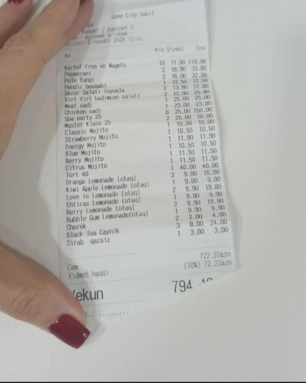 Bakıda restoranda 72 manat servis haqqı tutublar.XALQ xəbər verir ki, Sahil metrosunun yaxınlığında yerləşən “Love city” restoranında müştəridən 722 manatlıq hesaba görə 10 faiz servis haqqı tələb edilib.