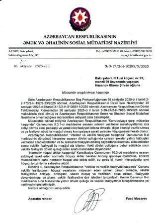 Məsələ ilə əlaqədar təkrar olaraq Baş Prokurora müraciət etmişəm. Məsələ ciddi nəzarətə götürülməlidir. Belə çıxır ki, publik hüquqi şəxslərdə vəzifəli şəxslərin hər hansı digər ödənişli fəaliyyətinə heç bir məhdudiyyət yoxdur. Çünki Əmək və Əhalinin Sosial Müdafiəsi Nazirliyi işində “Korrupsiyaya qarşı mübarizə haqqında” Qanunu rəhbər tutmur..."
