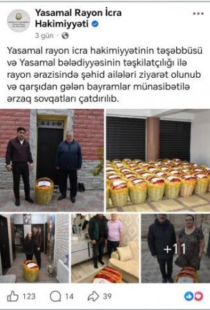 Vətəndaş Yasamal rayon icra hakimiyyətinin təşəbbüsü və Yasamal bələdiyyəsinin təşkilatçılığı ilə rayon ərazisində yaşayan şəhid ailələrinə bayramlar münasibətilə ərzaq sovqatları çatdırılmasının yalan olduğunu bildirib.İcra hakimiyyətinin payladığı sovqatla bağlı paylaşımına şərh yazan Şahin Əliyev bildirib ki, bunların hamısı yalandır: