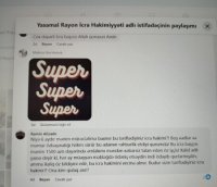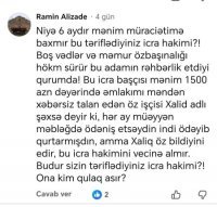 Bu icra başçısı mənim 1500 AZN dəyərində əmlakımı məndən xəbərsiz talan edən öz işçisi Xaliq adlı şəxsə deyir ki, hər ay müəyyən məbləğdə ödəniş etsəydin indi ödəyib qurtarmışdın. Amma Xaliq öz bildiyini edir, bu icra hakimini vecinə almır. Budur sizin təriflədiyiniz icra hakimi?! Ona kim qulaq asır?”.
