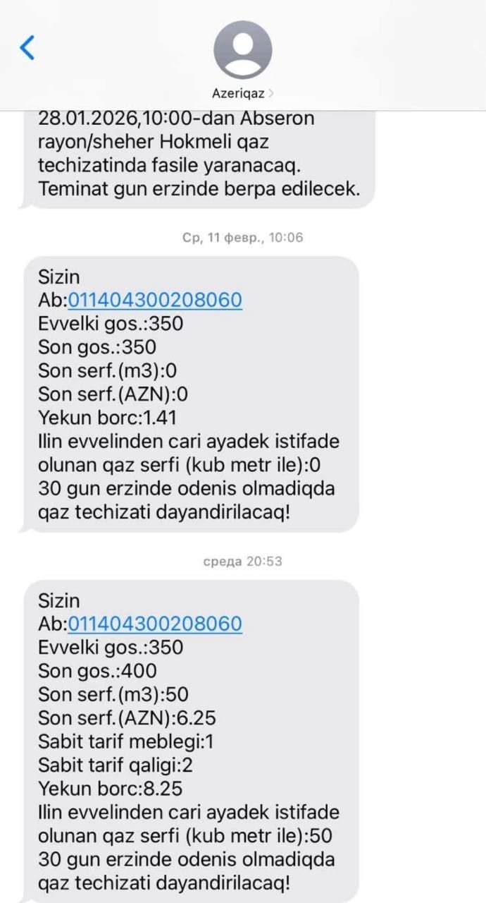 “Azəriqaz” İB bunu silib və mənə sms göndərib ki, 400 kub sərfiyyat var və filan tarixə qədər ödəniş etməsəniz qaz təminatı dayandırılacaq.