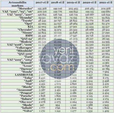 Son 5 ildə Azərbaycanda qeydiyyatda olan minik avtomobillərindən bəzilərinin sayı bu cür olub: