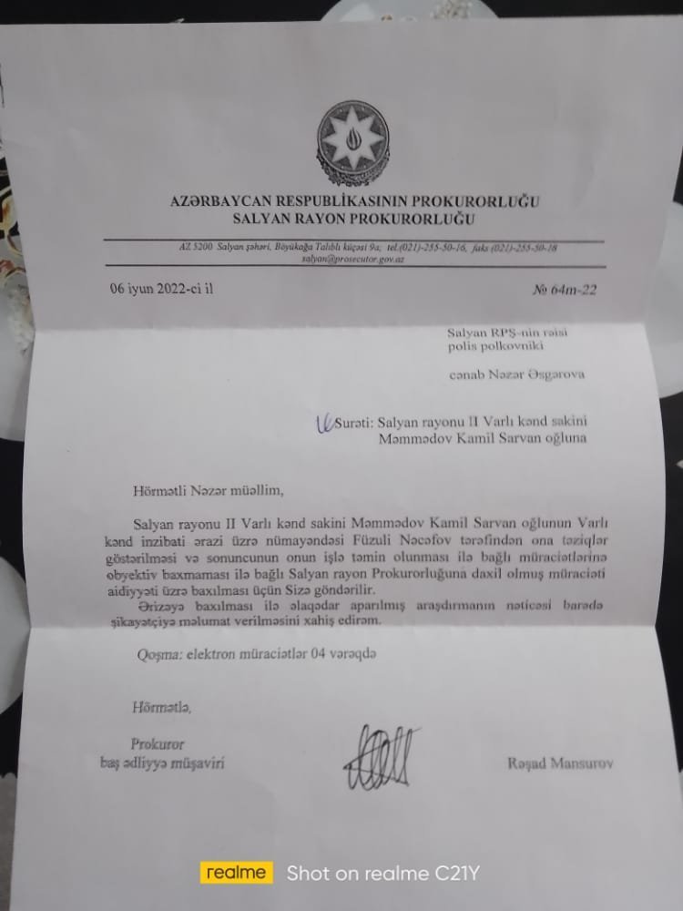 Kamil Məmmədov başçının hərəkətlərindən Salyan Rayon Prokurorluğuna, Daxili İşlər Nazirliyinə şikayət edib. Bundan bir neçə gün sonra polis şöbəsinə aparılıb: