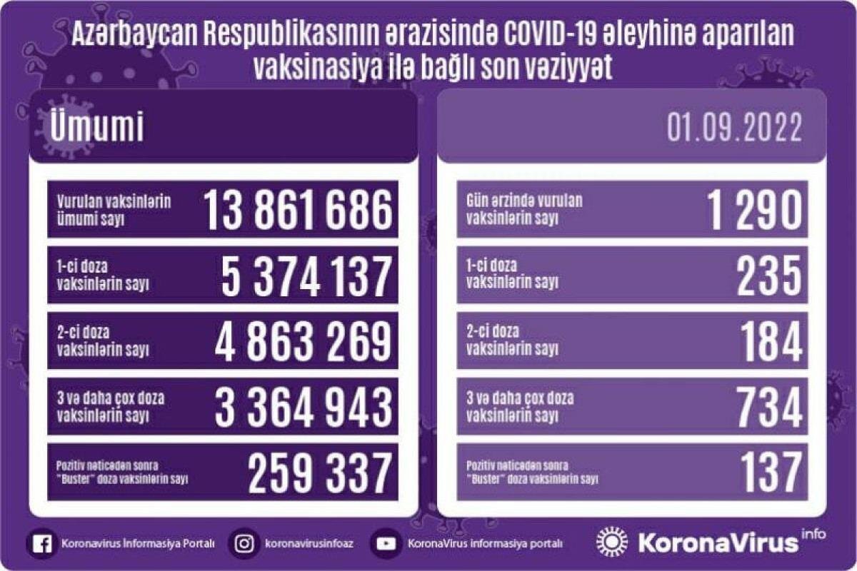 Vurulan vaksinlərin ümumi sayı 13 861 686, birinci mərhələ üzrə vaksinasiya olunanların ümumi sayı 5 374 137, ikinci mərhələ üzrə vaksinasiya olunanların sayı 4 863 269, üç və daha çox doza üzrə vaksinasiya olunanların sayı 3 364 943, pozitiv nəticədən sonra buster doza üzrə vaksinasiya olunanların sayı isə 259 337 nəfər təşkil edir.\\milli.az