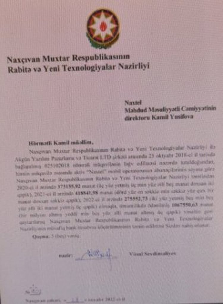 Maraqlıdır ki, “xan” həzrətlərinin taxtı laxlayan kimi, Naxçıvan MR Rabitə və Yeni Texnologiyalar Nazirliyi “Naxtel”ə rəsmi məktublar yazaraq, müxtəlif vaxtlarda ona verdiyi pulları geri istəməyə başlayıb. Həmin məktublara Seymur Talıbovun hansı cavablar verdiyi barədə hər hansı informasiyaya malik deyilik. Ancaq rəsmi məktublardan bir neçəsini ələ keçirə bilmişik. Buyurun, abunəçi sayının “Bakcell” və ya “Azercell”lə müqayisədə xeyli az olmasına baxmayaraq, “Naxtel”in niyə bu qədər ucuz xidmət göstərdiyinin sirlərini təsdiqləyən sənədlərlə tanış olun.