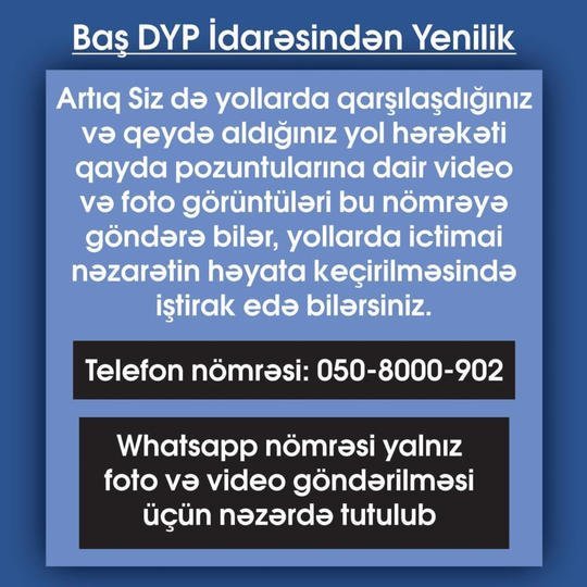 “Bakunews” xəbər verir ki, bu gündən vətəndaşlar yollarda qarşılaşdığı və qeydə aldığı yol hərəkəti qayda pozuntularına dair video və foto görüntülərini DYP-nin vatsap nömrəsini göndərə biləcəklər.