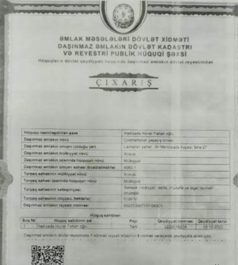 Müəmmalı çıxarış sənədiHazırki durum isə bundan ibarətdir ki, işbazlar hansısa yolla binaya çıxarış alıb, amma tikiliyə eksprtiza rəyi verilməyib və Şəhərsalma idarəsi binanın tikilməsinə icazə verməyib. Elə maraqlıdı odur ki, ayrı ayrı qurumlar bir birlərini ziddinə, zidd qərarlar verirlər. Bunlar külli pul verib reisterden məsələni həll etsə də bele, amma şəhərsalma razılaşmır bunlarla, səbəb binada olan qanuna ziddiyyətləri. Mikayıl Cabbarovun rəhbərlik etdiyi nazirliyin tabeçiliyində olan Əmlak məsələləri Dövlət Xidmətinin verdiyi çıxarış ciddi şübhələr yaradır və bunu növbəti yazımızda araşdıracayıq. Bunun cavabını kim verecek?