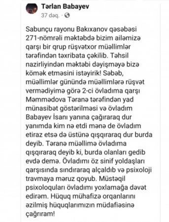 "Sabunçu rayonu Bakıxanov qəsəbəsi 271-nömrəli məktəbdə bizim ailəmizə qarşı bir qrup rüşvətxor müəllimlər tərəfindən təxribata çəkilib. Təhsil nazirliyindən məktəbi dəyişməyə bizə kömək etməsini istəyirik! Səbəb, müəllimlər günündə müəllimlərə rüşvət vermədiyimə görə 2-ci övladıma qarşı Məmmədova Təranə tərəfindən yad münasibət göstərilməsi və övladım Babayev İsanı yanına çağıraraq dur yanımda kim nə etdi mənə de övladım etiraz etsə də üstünə qışqıraraq dur burda deyib. Təranə müəllimə övladıma qışqıraraq deyib ki, burda olanları gedib evdə demə. Övladımı öz sinif yoldaşları qarşısında sındıraraq alçaldıb və psixoloji travmaya məruz qoyub. Müstəqil psixoloquları övladımı yoxlamağa dəvət edirəm. Hüquq mühafizə orqanlarını əzilmiş hüquqlarımızın müdafiəsinə çağrıram!"