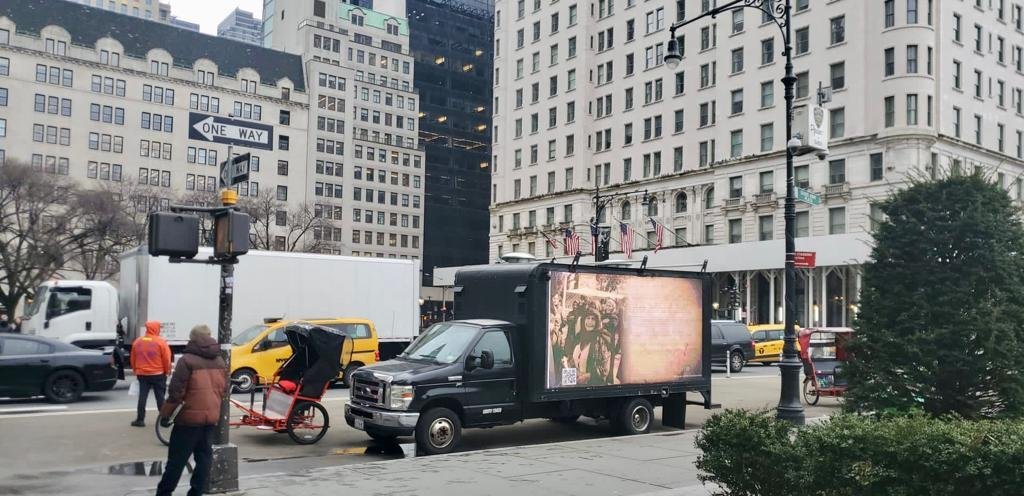 Ekranda Azərbaycan bayrağının, xəritəsinin, Xocalı soyqırımı qurbanlarının adları və fotoları nümayiş etdirilib. Təsvirlər “Xocalıya ədalət!”, “Xocalı soyqırımını tanıyın”, “Ermənistanın insanlığa qarşı cinayəti”, “Ermənistanın Xocalıdakı bir gecəlik soyqırımı”, “Erməni lideri hərbi cinayətləri etiraf edib”, “Azərbaycanlılar ədalət tələb edir!”, “Qarabağ Azərbaycandır!”, “Xocalını xatırla!”, “Biz xatırlayırıq!”, “Xocalı üçün dua et!”, “Xocalıda 63 uşaq, o cümlədən yeni doğulanlar öldürülüb!”, “1992-ci il 26 fevral. 613 azərbaycanlı, 106 qadın, 63 uşaq, 70 ahıl şəxs qətlə yetirilib. 1275 nəfər azərbaycanlı girov götürülüb. 76 uşaq əlil olub. 25 uşaq hər iki valideynini itirib. 130 uşaq valideynlərindən birini itirib, 8 ailə tamamilə məhv edilib” şüarları və çağırışları ilə müşayiət olunub.