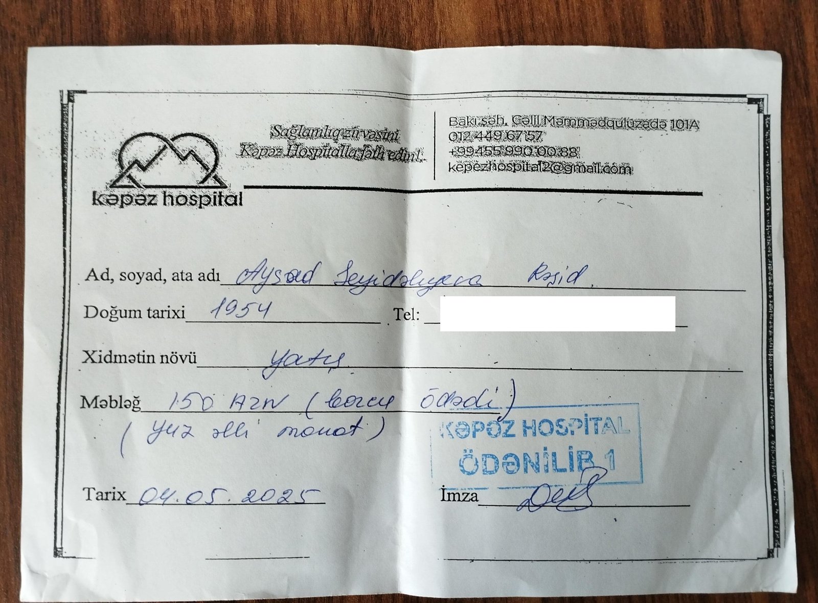 Bu sanki gizli əməliyyata bənzəyirdi. Aldıqları pulu xəstəxanadan gizli alırdılar. Dedik sığorta ilə gəlmişik, əldə pul yoxdu endirim edərdiz, bir qədər sonra dedilər 500 azn ödəyərsiz.