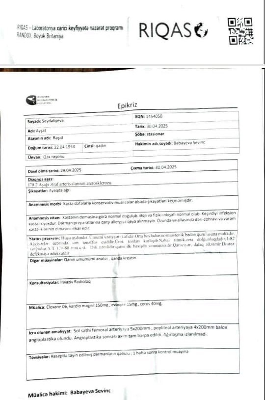 XALQ -a müraciət edən Aynurə Seyidəliyeva bildirir ki, xəstə ayağında yara olduğundan, yara sağalmadığından həkimə Qax rayonundan Bakıya gətirilmişdi. Bakıya gətirilməmişdən əvvəl Şəki şəhərində dopler müayinəsindən keçdikdən sonra damarlarında quruma olduğunu, yaranında ona görə sağalmadığını qeyd etdilər. Damar əməliyyatı üçün Bakıya gətirildi. Ayşad Seyideliyeva 15.04.2025 tarixində icbari tibbi sığorta göndərişi ilə damarlarındakı problem ilə əlaqədar “Beynəxalq Avropa hospitalında” çalışan Həkim invaziv radioloq Sevinc Babayeva tərəfindən əməliyyat olundu.