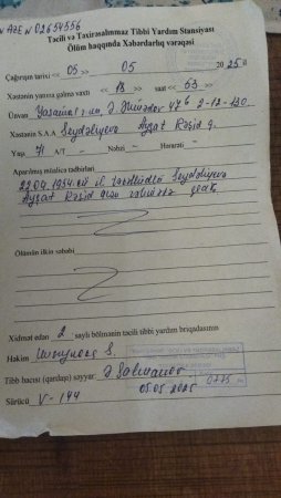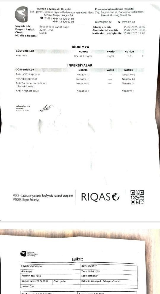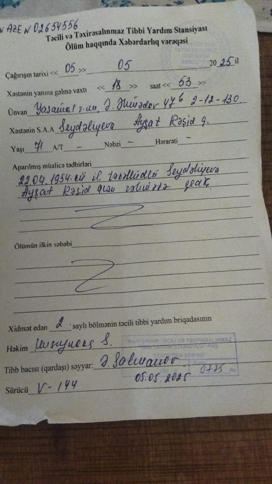 4 may tarixində xəstə evə gətirildi, 5 may 2025-ci il taxində isə xəstənin halı qəflətən pisləşdi biz təcili yardın çağırsaqda artıq gec idi və anamız həkim səhlənkarlığına görə vəfat etmişdir.