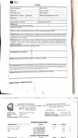 Püstə adlı xanım gəlib bizdən 600 manat pulu aldı. Bu xanım Avropa hospitalında müdür müavini işləyir. Biz ödənişi rəsmi qaydada ödəmə etmək istədiyimizi tələb edəndəndə, pulu əldən ödəməyimizi dedilər. Xəstəmizdə əməliyyatdadır o anda həkim deyəni etdik. Biz məcbur olub əməliyyat zamanı 600 manat ödədik. 16.04.2025-ci il tarixində xəstə evə buraxıldı və Sevinc Babayevanın koməkçisi dediyi bir necə agrıkəsici dərmanlar qəbul etdi.
