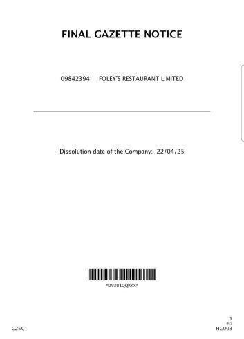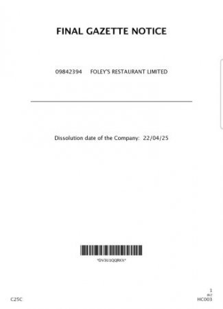 FOLEY'S RESTAURANT LIMITED şirkəti və eyniadlı lüks restoranın fəaliyyətinə isə bu ilin aprelində iflas qərarı ilə son verilib.
