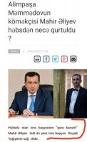 Ancaq buna da göz yummaq olardı. Burada ən dəhşətlisi isə budur ki, təxminən 3 ay əvvəl həmin bu Rəşad Tağıyev, əslində bu gün dəmir barmaqlıqlar arxasında oturmalı olan bir şəxs- Əliyev Mahir Məzahir oğlunun təqdimatını verərək ona " Dövlət qulluğunda fərqlənməyə görə" medalı ilə təltif olunmasına nail oldu. İndi sual olunur: bu Mahir Əliyev göstərdiyi "qulluqda" nə ilə fərqlənib? Hansı xidmətlərinə görə?
