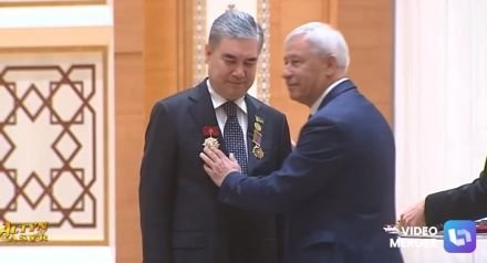 Videodan o da görünür ki, Azərbaycan xalqının adından türkmən lideri Qurbanqulu Berdıməhəmmədova “möhtəşəm mükafat” təqdim olunur. Təltifetmə mərasimi elə bir pafosla təşkil edilib ki, guya bu, əsrin hadisəsidir.