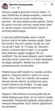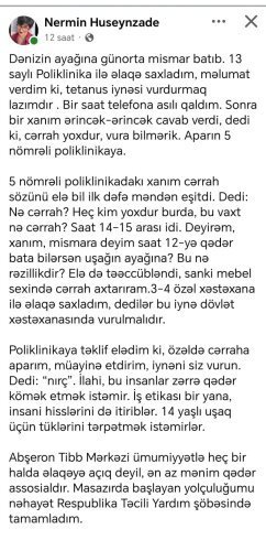 “Dənizin ayağına günorta mismar batıb. 13 saylı Poliklinika ilə əlaqə saxladım, məlumat verdim ki, tetanus iynəsi vurdurmaq lazımdır . Bir saat telefona asılı qaldım. Sonra bir xanım ərincək-ərincək cavab verdi, dedi ki, cərrah yoxdur, vura bilmərik. Aparın 5 nömrəli poliklinikaya.