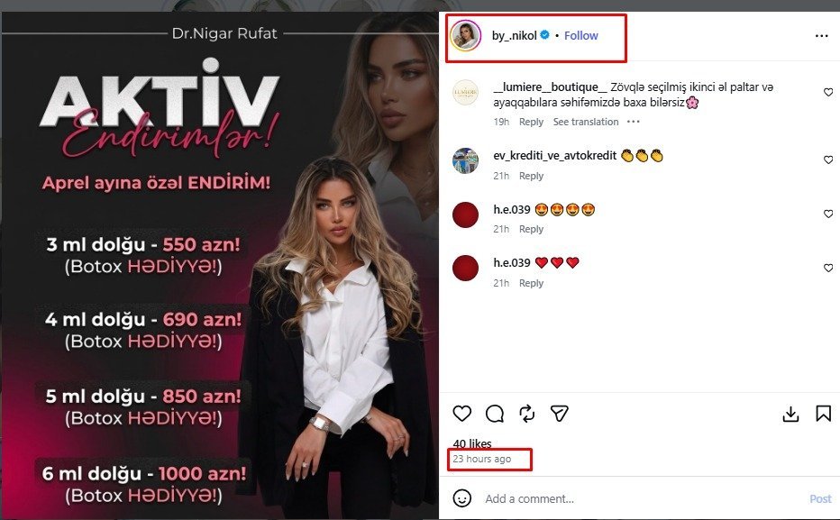 Nigar Rüfət isə fəaliyyətini gizli şəkildə etmir, sosial şəbəkələrdə də aktiv paylaşımlar edir. Ötən gün o, aprel ayına özəl endirim kampaniyasına start verdiyini pasiyentlərinə elan edib.