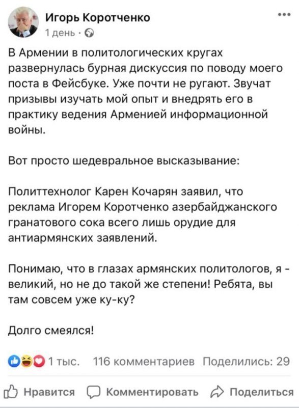 Коротченко пишет, что в Армении его «уже почти не ругают. Звучат призывы изучать мой опыт и внедрять его в практику ведения Арменией информационной войны. Вот просто шедевральное высказывание.