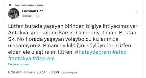 Onun sözlərinə görə, Hatay qadın voleybol komandasının 14 idmançısının qaldığı bina uçub, onlar da dağıntılar altında qalıb.