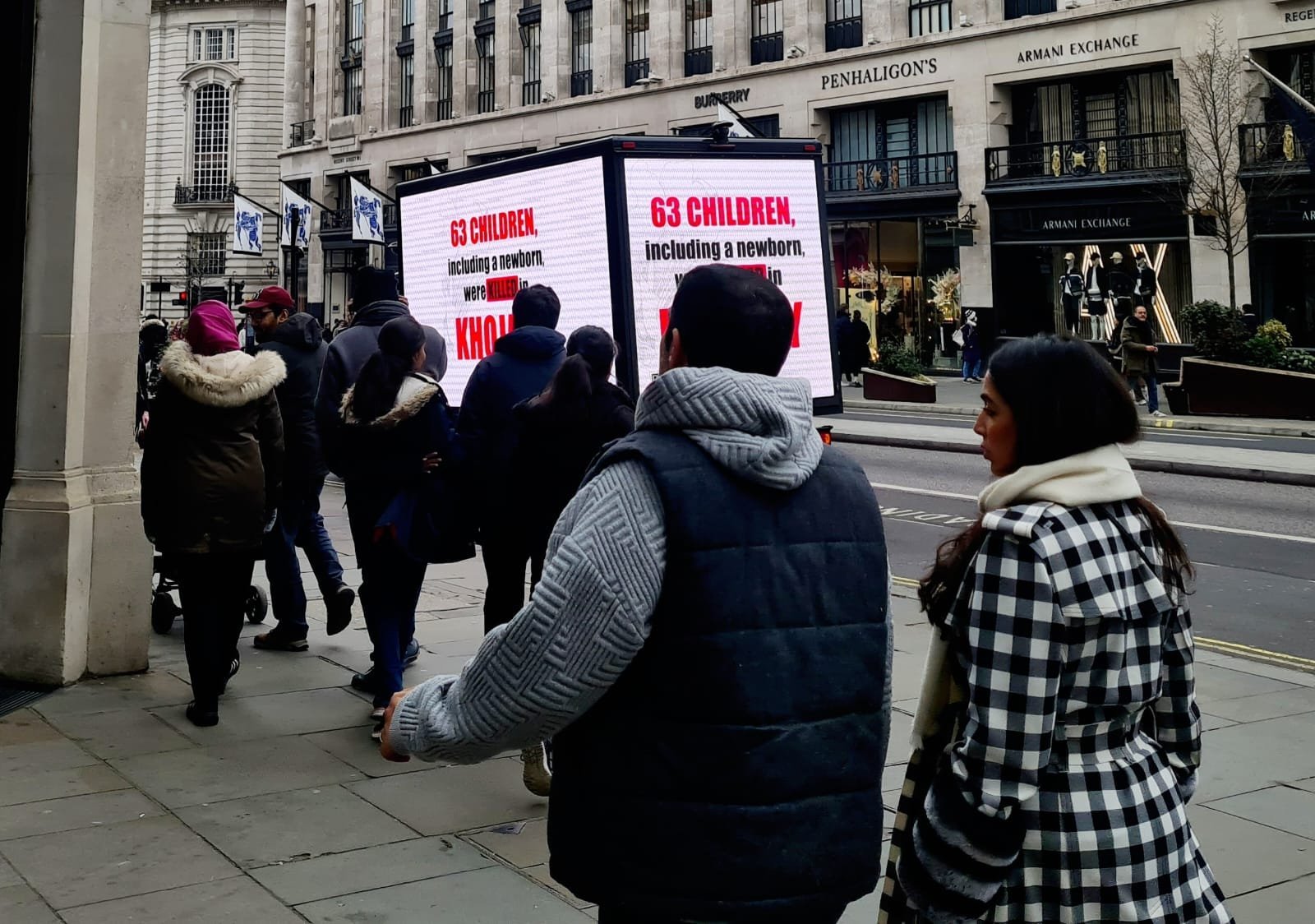 LED ekranlarda Azərbaycan bayrağının, xəritəsinin, Xocalı soyqırımı qurbanlarının adları və fotoları nümayiş etdirilib. Təsvirlər “Xocalıya ədalət!”, “Xocalı soyqırımını tanıyın”, “Ermənistanın insanlığa qarşı cinayəti”, “Erməni lideri hərbi cinayətləri etiraf edib”, “Erməni hərbi cinayətkarlarını məsuliyyətə cəlb edin!”, “Azərbaycanlılar ədalət tələb edir!”, “Qarabağ Azərbaycandır!”, “Xocalını xatırla!”, “Xocalıda qətlə yetirilən 63 uşağı xatırla!”, “Xocalıda 63 uşaq, o cümlədən yeni doğulanlar öldürülüb!”, “1992-ci il 26 fevral. 613 azərbaycanlı, 106 qadın, 63 uşaq, 70 ahıl şəxs qətlə yetirilib. 1275 nəfər azərbaycanlı girov götürülüb. 76 uşaq əlil olub. 25 uşaq hər iki valideynini itirib. 130 uşaq valideynlərindən birini itirib, 8 ailə tamamilə məhv edilib” şüarları və çağırışları ilə müşayiət olunub.