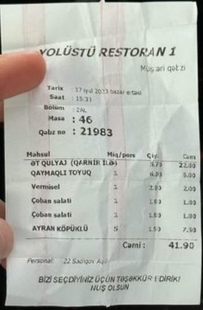 "Deməli, bu Astara yolunda "Yolüstü" restoranında dedik bir tikə yemək yeyək. Yeməkləri soruşduq (iş yerlərində olduğu kimi) qiymətləri normal dedilər..."DİA.AZ bildirir ki, bu barədə" Müştərinin Səsi" sosial qrupundakı paylaşımında İsa Nəcəfov adlı istifadəçi giley edir.