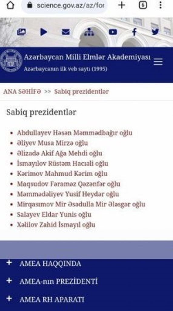 Qurumun saytının “AMEA haqqında” bölməsində akademiyanın keçmiş rəhbərlərinin adı qeyd edilib. Həmin siyahıda akademik Ramiz Mehdiyevin adı yazılmayıb.