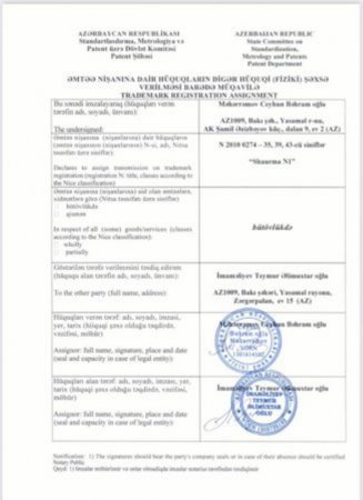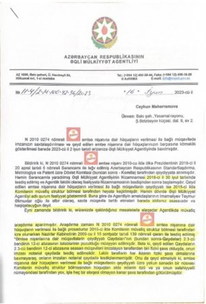 Nəzərinizə çatdıraq ki, əqli mülkiyyət hüququn “Əmtəə nişanları və coğrafi göstəricilər” üzrə “Sənaye Mülkiyyəti” bülletenində tanınması barədə sənədli sübutlar da vəkili tərəfindən əldə olunub.