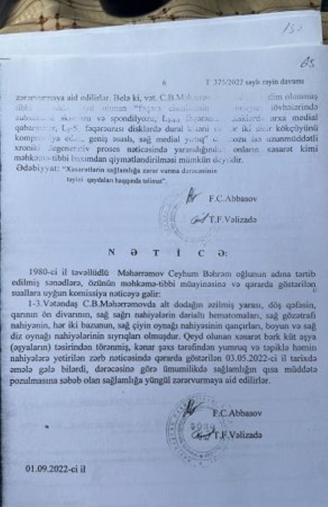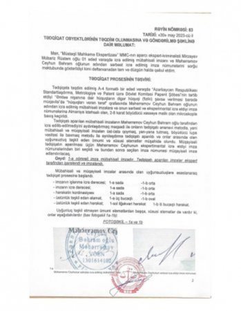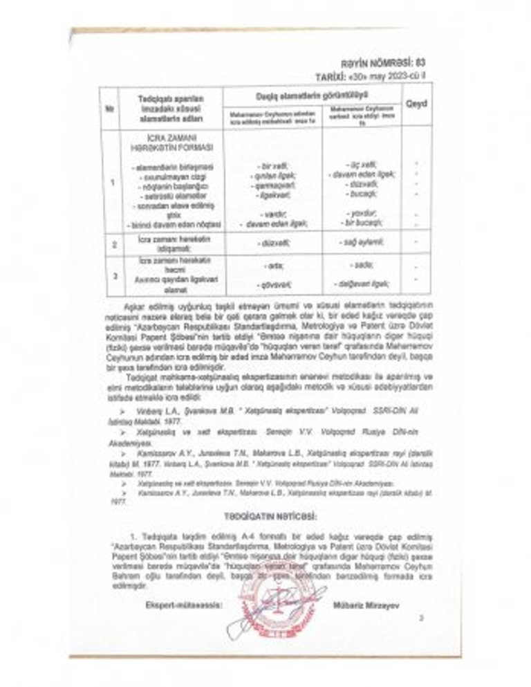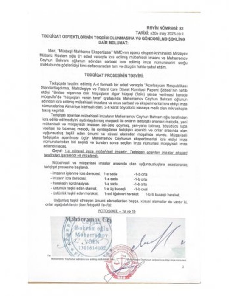 Buna görə, Ceyhun Məhərrəmovun yerinə çəkilən imza, ilkin olaraq ekspertizaya göndərilib, və əlyazma üzrə ekspert Şükür Hüseynovun rəyinə əsasən bilinib ki, “imza kobud şəkildə saxtalaşdırılıb”.