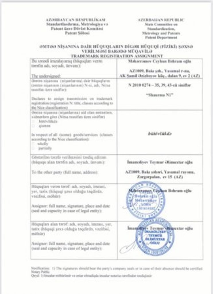 Hurriyyet.az xəbər verir ki, “SHAURMA №1”-nın tanınmış şəbəkəsinin keçmiş direktoru Ceyhun Məhərrəmov bildirib ki, ona Standartlaşdırma, Metrologiya və Patent üzrə Dövlət Komitəsi tərəfindən 4 mart 2010-cu il tarixli (reyestr nömrəsi 2010 0274) “SHAURMA №1” nömrəli əmtəə nişanına hüququnun təsbit edilməsi həmin sertifikat ilə verilmişdir. Lakin vəkilinin araşdırması zamanı məlum olub ki, eyni zamanda, həm buraxılış tarixi, həm də reyestr nömrəsi ilə eyni olan sənəd Teymur İmamverdiyevə də verilib.Deməli, ilkin olaraq, Ceyhun Məhərrəmovun Teymur İmamverdiyevə hüquqlarının könüllü keçməsi haqqında imza saxtalaşdırıb. Bundan sonra Teymur İmamverdiyev, Standartlaşdırma üzrə Dövlət Komitəsinin məsul şəxslərinin “köməyi ilə” əqli mülkiyyətə sahibliyi barədə saxta sənəd alaraq 3-cü şəxslər vasitəsilə onu öz adına keçirə bilib.