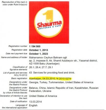 Bundan əlavə, Ümumdünya Əqli Mülkiyyət Təşkilatının Madriddə (İspaniya) yerləşən mənzil-qərargahı 3 mart 2010-cu il tarixli 2010 0274 reyestr nömrəli “SHAURMA №1”nömrəli əmtəə nişanı hüququn Ceyhun Məhərrəmova aid olduğunu təsdiq edən cavabı elektron məktub ilə göndərib. Həmçinin bu hüququn 2023-cü ilin oktyabr ayının sonuna qədər Belarus, Çin, İran, Qazaxıstan, Ukrayna və Rusiya ərazisində də tanındığı təsdiqlənib.