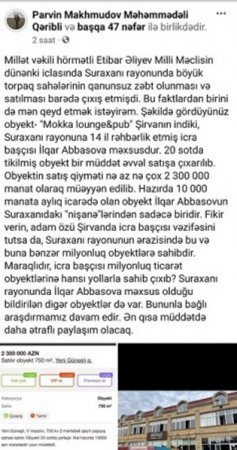 Maraqlıdır ki, deputatın bu çıxışından bir gün sonra onun köməkçisi Pərvin Mahmudov sosial media hesabından paylaşdığı statusda icra başçısı İlqar Abbbasovun Suraxanıda olan milyonluq əmlakını satışa çıxardığını yazıb.
