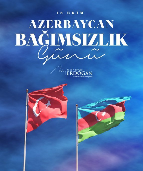 Türkiyə Prezidenti Rəcəb Tayyib Ərdoğan Azərbaycanı 18 Oktyabr - Müstəqilliyin Bərpası Günü münasibətilə təbrik edib.Türkiyə lideri bununla bağlı “X” sosial şəbəkəsində paylaşım edib.