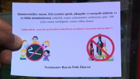 Yetkinlik yaşına çatmayanlara alkoqollu içkilərin və tütün məmulatlarının satışının qarşısının alınması istiqamətində polis əməkdaşları tərəfindən maarifləndirmə və profilaktik işlər davam etdirilir. Nərimanov RPİ əməkdaşlarının keçirdikləri tədbir zamanı yetkinlik yaşına çatmayanlara tütün məmulatları satan köşk və mağazalar aşkar olunub. Azyaşlılara tütün məmulatı satan satıcılarla profilaktik söhbətlər aparılıb.