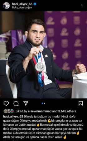 “Əlimdə tutduğum medal ikinci dəfə qazandığım olimpiya mükafatıdır. Bunu qızıl etmək və üçüncü dəfə olimpiya medalına yiyələnmək üçün vaxta az qalır. Buna sahib olmaq üçün əlimdən gələn hər şeyi edirəm. Allah bizə güc və qələbə nəsib etsin”, - H.Əliyev yazıb.