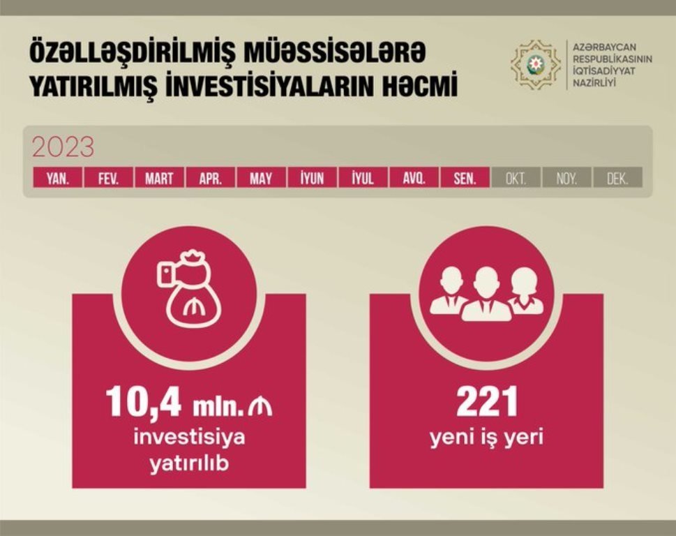 “Bu ilin yanvar-sentyabr aylarında Azərbaycanda investisiya müsabiqələri vasitəsilə özəlləşdirilmiş müəssisələrə ümumilikdə 10,4 milyon manat investisiya yatırılıb”.Bunu iqtisadiyyat naziri Mikayıl Cabbarov “X” sosial şəbəkəsindəki hesabında bildirib.