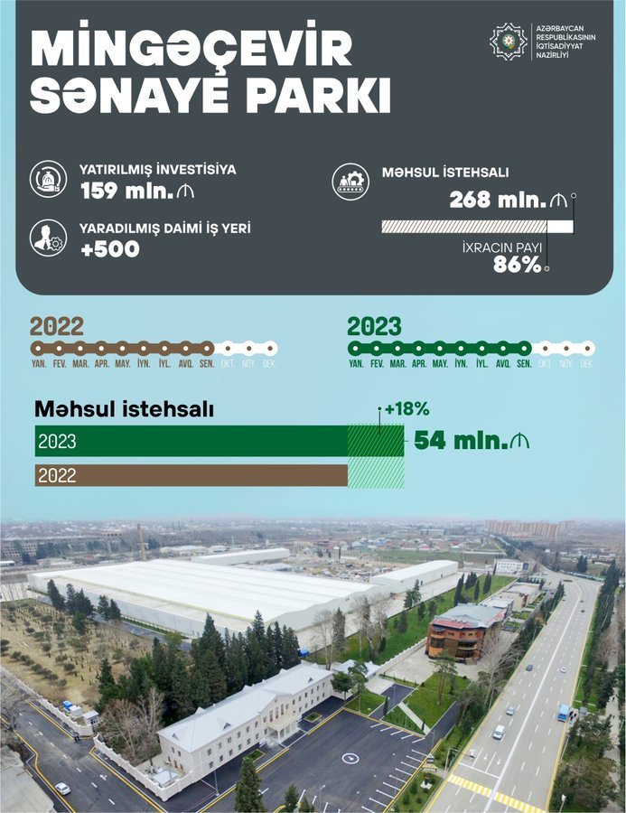 Onun sözlərinə görə, indiyə qədər Mingəçevir Sənaye Parkına 159 milyon manatlıq investisiya yatırılıb, 500-dən çox daimi iş yeri yaradılıb, 268 milyon manatlıq məhsul istehsal olunub və bunun 86%-i ixrac edilib.