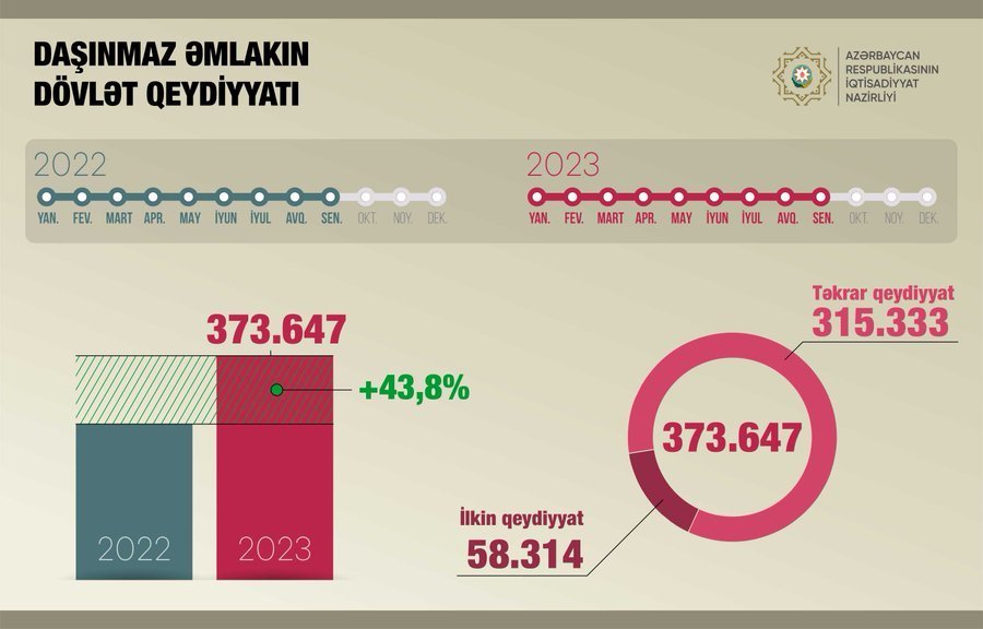 “2023-cü ilin yanvar-sentyabr ayları ərzində 373 647 daşınmaz əmlak üzərində mülkiyyət hüquqları dövlət qeydiyyatına alınıb”.Bunu iqtisadiyyat naziri Mikayıl Cabbarov “X” sosial şəbəkəsindəki hesabında bildirib.