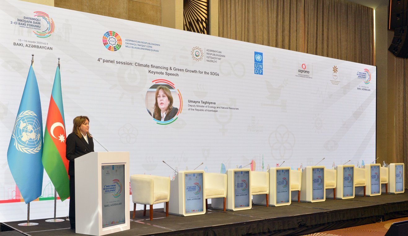 Dayanıqlı maliyyə və investisiya mövzusunda II Bakı Forumunun 2-ci günündə iqlim maliyyəsi və “yaşıl” inkişaf, biomüxtəlifliyə investisiya yatırılması və Azərbaycanda investisiya imkanları mövzularında sessiyalar keçirilib.Dayanıqlı maliyyə və investisiya mövzusunda II Bakı Forumu bir neçə mövzuda sessiyalarla davam edib. Forumun 2-ci günündə Dayanıqlı İnkişaf Məqsədlərinə (DİM) nail olmaq üçün iqlim maliyyəsi və “yaşıl” inkişaf mövzusunda sessiya keçirilib. Tədbirdə bir sıra xarici ölkələrin qurumlarının və beynəlxalq təşkilatların nümayəndələri iştirak ediblər. Sessiyada mövzu üzrə əsas məruzəçi - ekologiya və təbii sərvətlər nazirinin müavini Umayra Tağıyeva Azərbaycanın qlobal iqlim dəyişikliyi ilə mübarizədə fəal iştirakı, ölkəmizdə “yaşıl” inkişaf məqsədilə həyata keçirilən tədbirlər barədə ətraflı məlumat verib. Qeyd olunub ki, “Azərbaycan 2030: sosial-iqtisadi inkişafa dair Milli Prioritetlər”ə uyğun olaraq, təmiz ətraf mühit və “yaşıl” artımın təmin olunması məqsədilə bərpa olunan enerji mənbələrindən və səmərəli enerji texnologiyalarından istifadənin artırılması istiqamətində mühüm layihələr həyata keçirilir. Bu sahədə ölkəmizin beynəlxalq təşkilatlar və maliyyə qurumları, eləcə də xarici şirkətlərlə uğurlu əməkdaşlığı genişləndirilir.