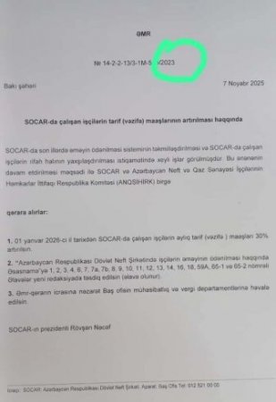 Xəbər verildiyi kimi, SOCAR prezidenti Rövşən Nəcəfin 7 noyabr 2025-ci il tarixli əmri ilə şirkət əməkdaşlarının maaşlarının 2026-cı ildən etibarən 30% artırılması barədə məlumat mətbuatda yayılıb.32gun.az xəbər verir ki, sosial şəbəkələrdə sənədin fotosu paylaşıldıqdan sonra diqqət çəkən bir detal geniş müzakirələrə səbəb olub.