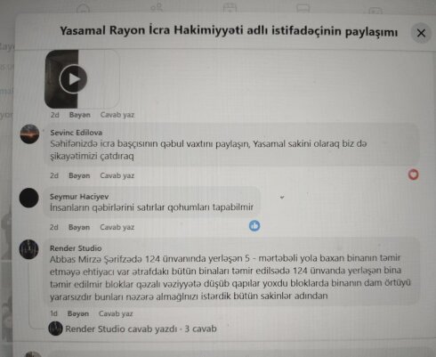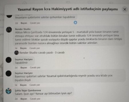 Bu paylaşıma gələn şərhlərin əksəriyyəti isə sakinlərin şikayəti olub. Şikayətçi Seymur Hacıyev iddia edib ki, Yasamalda köhnə qəbir yerləri gizli formada sayılır: “İnsanların qəbirlərini satırlar. Qohumları tapa bilmir. Xüsusilə baxımsız qəbirləri satırlar. Yasamal qəbirsanlığında reyster yox, sıra kitabı yox. Biabırçılıqdır”.