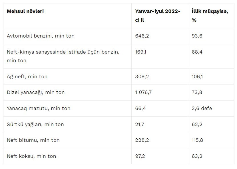 Məlumata görə, yanvar-iyul aylarında avtomobil benzininin istehsalı 6,4%, dizel yanacağının istehsalı 26,2%, neft-kimya sənayesində istifadə üçün benzin istehsalı 31,6%, neft koksunun istehsalı 36,8%, sürtkü yağlarının istehsalı isə 37,8% azalıb.