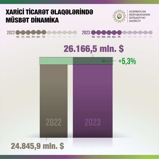 “Ölkəmizin xarici ticarət əlaqələrinin genişləndirilməsi istiqamətində müşahidə olunan müsbət dinamika şəraitində bu ilin yanvar-iyun aylarında ticarət dövriyyəsi ötən ilin müvafiq dövrü ilə müqayisədə 5,3 faiz artaraq 26 166,5 milyon dollar olub”.Bu barədə iqtisadiyyat naziri Mikayıl Cabbarov özünün “Twitter” hesabında yazıb.