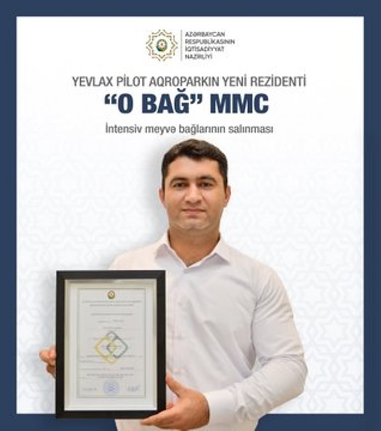 Yevlax Pilot Aqroparkda “O Bağ” MMC və fərdi sahibkar Mirsahib Səmədova rezident statusu verilib.Bunu iqtisadiyyat naziri Mikayıl Cabbarov “X” sosial şəbəkəsindəki hesabında bildirib.