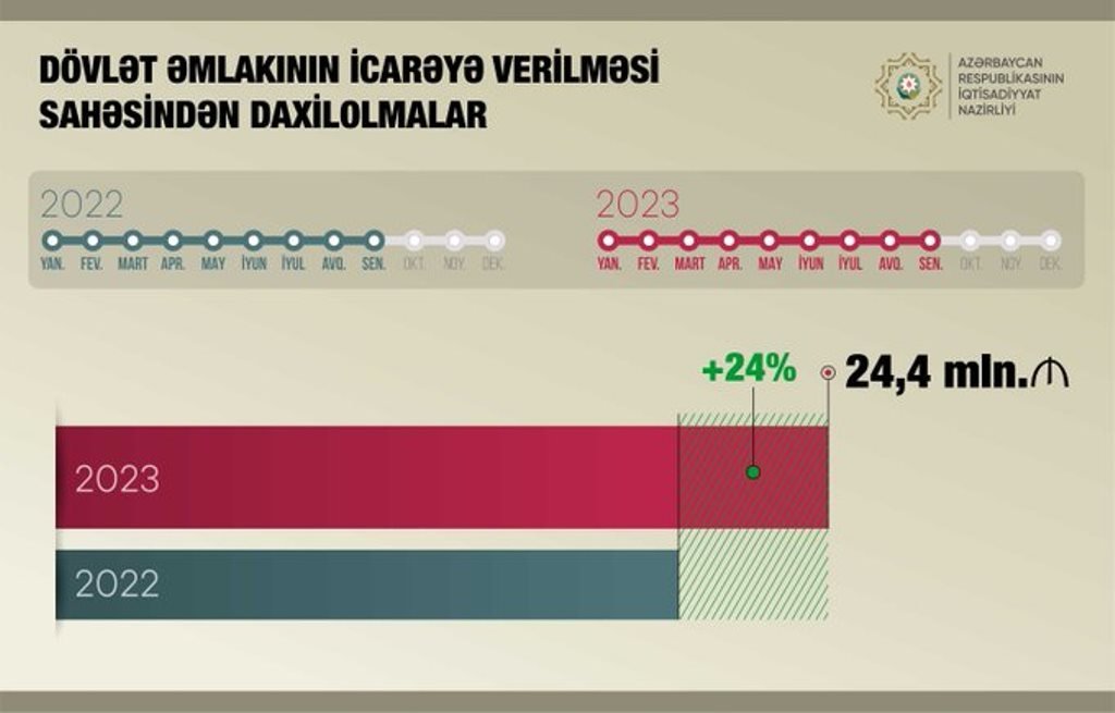“Bu ilin yanvar-sentyabr aylarında Azərbaycanda dövlətə məxsus daşınmaz əmlakların icarəyə verilməsindən dövlət büdcəsinə 24,4 milyon manat vəsait daxil olub”.Bunu iqtisadiyyat naziri Mikayıl Cabbarov “X” sosial şəbəkəsindəki hesabında bildirib.