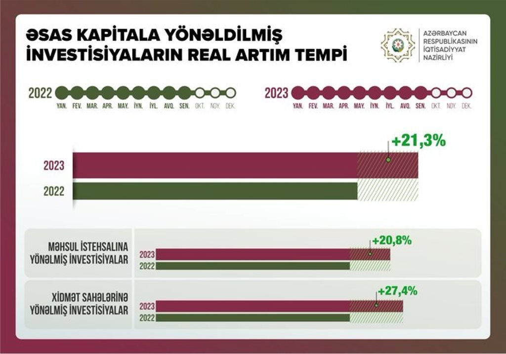 Xatırladaq ki, 9 ay ərzində ölkədə əsas kapitala 12 milyard 728,9 milyon manat və yaxud ötən ilin eyni dövrü ilə müqayisədə 21,3% çox vəsait yönəldilib. Son 1 ildə neft-qaz sektoruna investisiyalar 18,1%, qeyri-neft-qaz sektoruna investisiyalar isə 23,2% artıb.